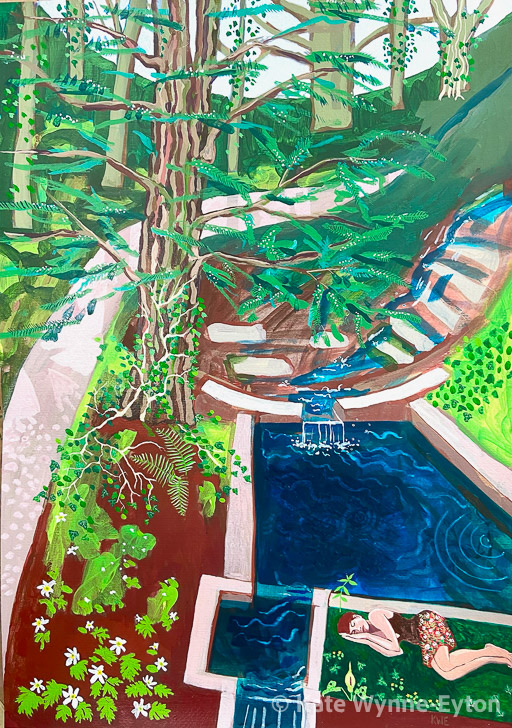 This painting is based on a December day in the Chiltern Hills, England. It looks for beauty in the midst of winter and re-imagines a cold water swim. The red towel makes a light hearted reference to the robes of a Buddhist monk, and the kitsch summer house suggests a Buddhist temple, as echoes of the past.