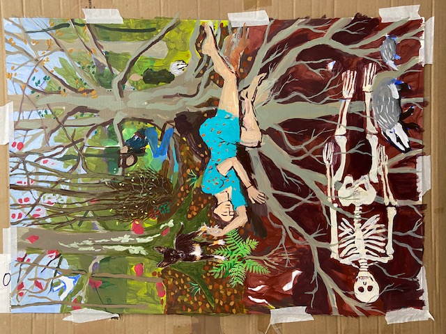 My response to a music event at a Sussex coppice wood at the beginning of May, which marked the migratory return of the nightingale. The tall trees in the background are coppiced oak. They grew into that shape when competing with other trees, hornbeams, recently harvested and regenerating from their huge, intact root systems, leaving the slender oaks towering high above. Lying in the grass that starry night, I listened to the interwoven song of woman and nightingale and was transported somewhere transcendent. The flame-like woman is both real and of the present moment, and also a ghost from past times, brought to mind by story telling around the fire that evening.