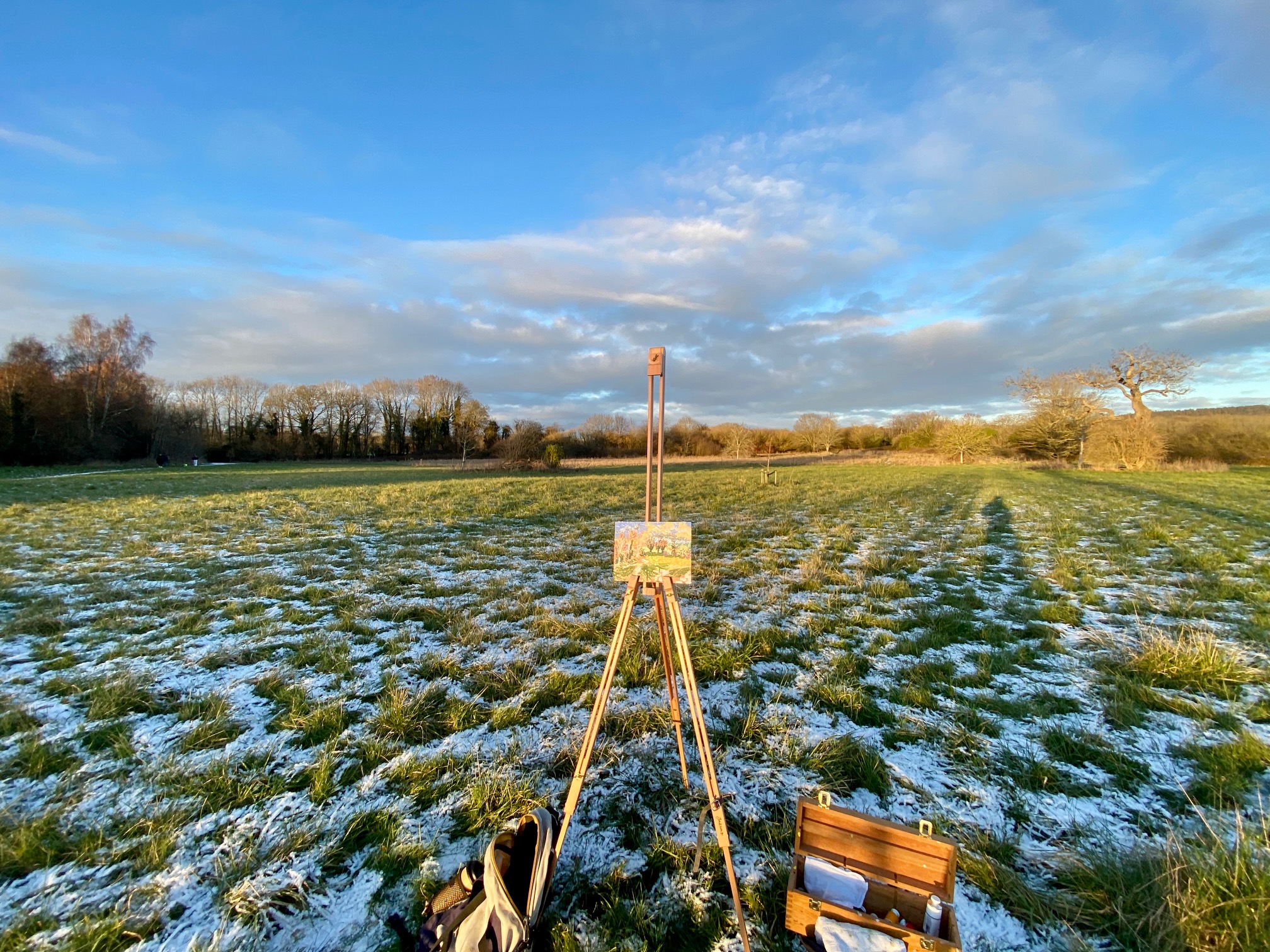 I painted the watermeadows en plain air to capture the light of the late afternoon winter sun, shortly before dusk, when the trees and hedgerows shone golden in the sun's rays, particularly the gnarled old oak. That day, the first snowfall of the year was melting, and the remaining patches of snow on the grass added to the patchwork of light and colour and high contrast. This is the first in a series of oil paintings, using oil specifically to optimise the luminosity of my work, with light a metaphor. The very small scale is new to me, and something I'm exploring as a way to create a sense of intimacy.